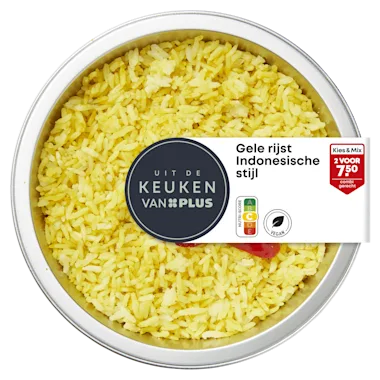 89% Gestoomde rijst (water, rijst), 7% kokosmelk (kokosmelkextract, water), raapzaadolie, conserveermiddel: gebufferde azijn, rode peper, suiker, bouillonpoeder (gedroogde groenten (ui, knoflook, tomaat, wortel, pastinaak, prei), gedroogde kruiden (tijm, peterselie), SELDERIJBLAD, foelie, venkelzaad, fenegriek, witte peper, SELDERIJZAAD, rode peper, kurkuma), 0,3% kurkuma, zout, water, citroengras, salamblad, pandanblad, azijn, gember, laos, limoenblad.