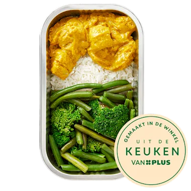 Jasmijnrijst (gekookte rijst (water, jasmijnrijst), raapzaadolie, conserveermiddel: gebufferde azijn), kip met kerrie en kokosmelk (kippenvlees, kokosmelk (kokosmelkextract, water), ui, water, raapzaadolie, kemirinoten, gemodificeerd maïszetmeel, knoflookpuree, conserveermiddel: gebufferde azijn, suiker, zout, citroen, groentebouillonpoeder (gedroogde groenten (ui, knoflook, tomaat, wortel, pastinaak, prei), specerijen (SELDERIJ), kruiden (SELDERIJ)), kerriepoeder (kurkuma, MOSTERDMEEL, korianderzaad, komijnzaad, gemberpoeder, paprikapoeder, venkelzaad, fenegriekzaad, witte peper, foelie, kardemom), citroengras, gember), broccoli, sperziebonen.