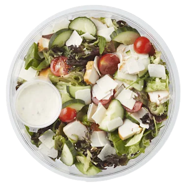 ijsbergsla, rucolamelange (lollo rosso, rucola, red chard), cherrytomaten, komkommer, gerookte kipfilet (kipfilet, specerijenextracten (knoflook, foelie), zout, dextrose, specerijen, rook, gedroogde pastinaak, conserveermiddel: E250), mayonaise met truffel (plantaardige oliën (raap, olijf), natuurazijn, water, SCHARRELKIPPENEI-EIGEEL, aroma’s (SELDERIJ, SOJA), vloeibare suiker, suiker, zout, MOSTERDZAAD, witte peper, truffel (Tuber aestivum Vitt.), champignongranulaat, conserveermiddel: E202, natuurlijk rozemarijn aroma), Grana Padano flakes (rauwe MELK, zout, conserveermiddel: EI-LYSOZYM, dierlijk stremsel).