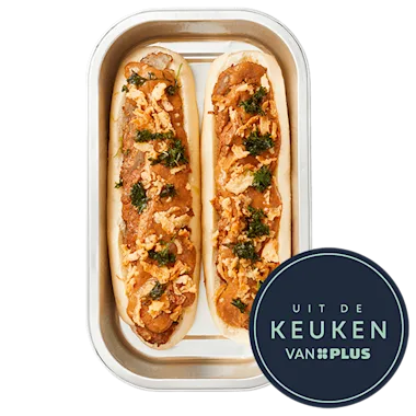 Wit broodje (TARWEBLOEM, water, bakkerszout, bakkersgist, gefermenteerd TARWEBLOEM, gefermenteerd gedroogd TARWEZUURDESEM, dextrose, TARWEMOUTMEEL, aroma, antioxidant: E300, koolzaadolie), gehaktbal (55% varkensvlees, 30% rundvlees, SCHARRELEI, TARWEBLOEM, voedingszuur: E326/E262/E330, zout, specerijen, TARWEZEMELEN, dextrose, conserveermiddel: E202, zonnebloemolie, gebrande suiker), pindasaus met kokosmelk (water, 30% PINDA'S, 13% kokosmelk (53% kokosextract, water, voedingszuur: citroenzuur), SOJASAUS (water, azijn, SOJABONEN, zout), suiker, gebrande suikerstroop, Spaanse peper, knoflook, gember, zout, limoenblad, gekarameliseerde suiker), gebakken uitjes (ui, palmolie, TARWEBLOEM, zout), geroosterde krulpeterselie (peterselie, olijfolie).