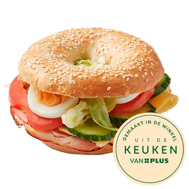 witte tarwebagel met sesam met tomaat, beenham, ijsbergsla, jong belegen 48+ kaas, gekookt ei en komkommer
