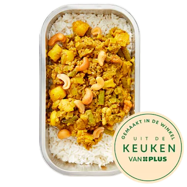 jasmijnrijst (gekookte rijst (water, jasmijnrijst), raapzaadolie, conserveermiddel: gebufferde azijn), rundvlees en groenten met appel en CASHEWNOTEN (ui, appel (appel, antioxidant: E300/E301/E302, zuurteregelaar: E331), rundvlees, sperziebonen, water, roombereiding (room (MELK), gemodificeerd maïszetmeel, stabilisator: E407), CASHEWNOTEN, rozijnen (rozijnen, katoenzaadolie), MELK, sinaasappelsap uit concentraat, raapzaadolie, conserveermiddel: gebufferde azijn, knoflookpuree, kerriepoeder (kurkuma, MOSTERDMEEL, koriander, komijn, venkelzaad, paprikapoeder, gember, fenegriek, witte peper, foelie, kardemom), zout, citroensap (citroensap, conserveermiddel: E224), specerijen (kaneel, koriander, kurkuma, komijn, fenegriek, MOSTERDZAAD, zwarte peper), azijn, groentebouillonpoeder (gedroogde groenten (ui, knoflook, tomaat, wortel, pastinaak, prei), specerijen (SELDERIJ), kruiden (SELDERIJ)).