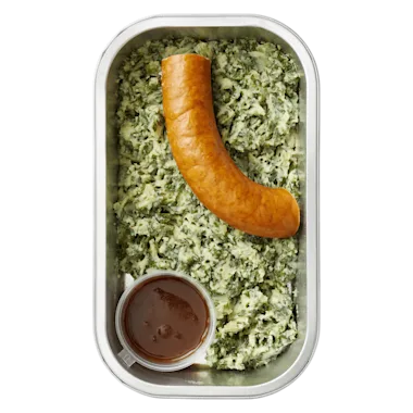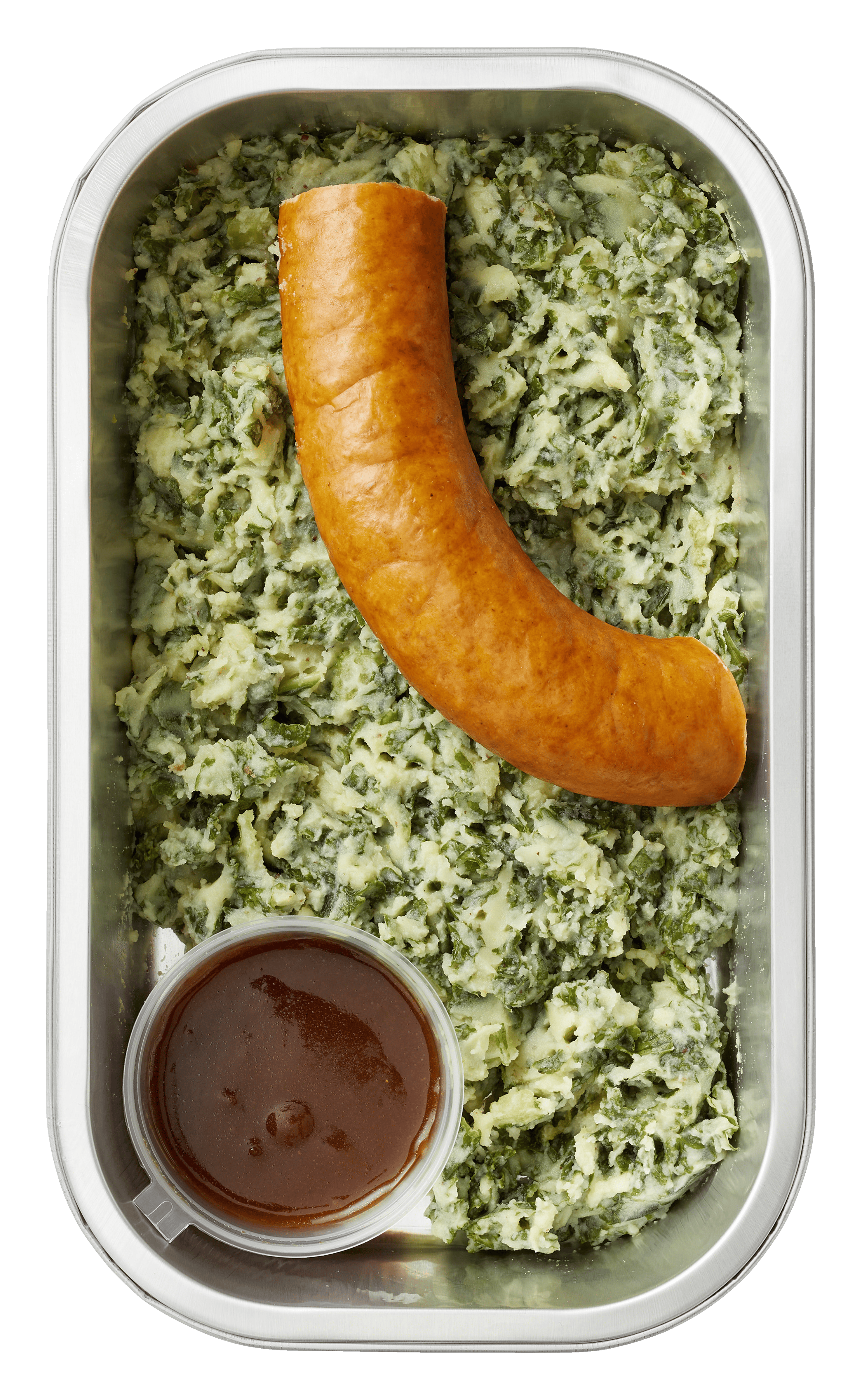 boerenkoolstamppot (aardappel, boerenkool, water, conserveermiddel: E261, sojaolie (volledig geraffineerd), zeezout, volle MELKPOEDER, verdikkingsmiddel: xanthaangom, witte peper), rookworst (varkensvlees, varkensvet, zout, specerijen, dextrose, voedingszuur: E262/E330, stabilisator: E450, zuurteregelaar: E575, antioxidant: E300/E301, rode bietenpoeder, water, natuurlijk aroma, aroma, glucosestroop, conserveermiddel: E250, peterselie, citroenschil, rook, varkensdarm), jus (water, raapzaadolie, suiker, gemodificeerd aardappelzetmeel, aroma's, uienpoeder, tomatenpuree, uiengranulaat, voedingszuur: E270, maltodextrine, gistextract, gebrande suiker, specerijen (witte peper, foelie), conserveermiddel: E202).