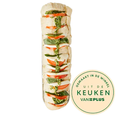 stokbrood (tarwebloem, water, bakkerszout, bakkersgist, dextrose, tarwemoutmeel, antioxidant: e300, koolzaadolie), buffelmozzarella (buffelmelk, zout, stremsel), tomaat, pesto (zonnebloemolie, basilicum, geraspte kaas (melk, zout, aardappelzetmeel, zuursel, dierlijk stremsel), cashewnoten, water, azijn, citroensap, knoflook, suiker, zout, specerijen, verdikkingsmiddel: guarpitmeel/xanthaangom), basilicum.
