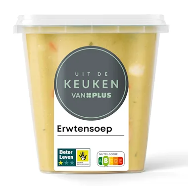 Ingrediënten :Groentebouillon (water, groenten-extract (wortel, ui, prei, KNOLSELDERIJ, BLEEKSELDERIJ)), 19% spliterwten, KNOLSELDERIJ, 7% rookworst (91% varkensvlees*, aardappelzetmeel, water, zuurteregelaar: E326, zout, voedingszuur: citroenzuur, natuurlijk aroma, rundercollageen, stabilisator: E451, rookaroma, dextrose, conserveermiddel: E261/E250, antioxidant: E301, specerijextracten), wortel, aardappel, 1,9% spekblokjes (91% varkensvlees*, water, zout, antioxidant: E331/E392, gerookt zout, conserveermiddel: E250), ui, prei, BLADSELDERIJ, zonnebloemolie, zout, zwarte peper, knoflook.