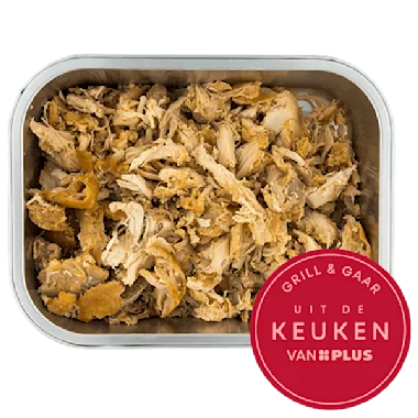 53% nieuwe plus kipfilet, 35% nieuwe plus kippendijvlees, water, azijn, natuurlijk aroma, aardappelzetmeel, zout, specerijen, aroma's, gedroogde ui, kippeneiwit, peperextract, bruine suiker, knoflook, rookaroma, maltodextrine, gedroogde paprika, dextrose, citroenschil, voedingszuur: citroenzuur.