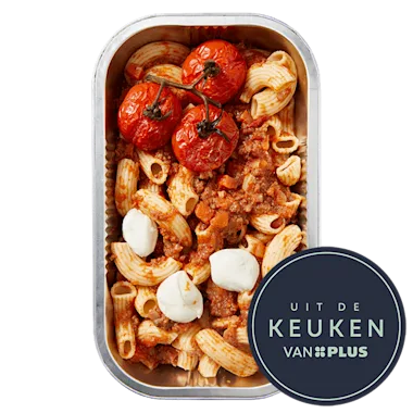 Gekookte pasta (gekookte pasta (water, harde TARWEGRIESMEEL), water, raapzaadolie, gebufferd azijnpoeder (conserverend ingrediënt), azijn), tomatensaus met varkens- en rundergehakt (tomatenblokjes in saus (tomaat, tomatensap, voedingszuur: citroenzuur), varkensgehakt, rundergehakt, BLEEKSELDERIJ, ui, wortel, tomatenpuree, gemodificeerd maiszetmeel, raapzaadolie, zout, gebufferd azijnpoeder (conserverend ingrediënt), knoflookpuree, sambal (rode peper, zout, voedingszuur: azijnzuur), suiker, kruidenmix (gedroogde ui, gedroogde paprika, oregano, majoraan), zwarte peper, laurierblad), gepofte cherrytomaten (cherrytomaten, olijfolie), buffelmozzarella (BUFFELMELK, zout, stremsel).