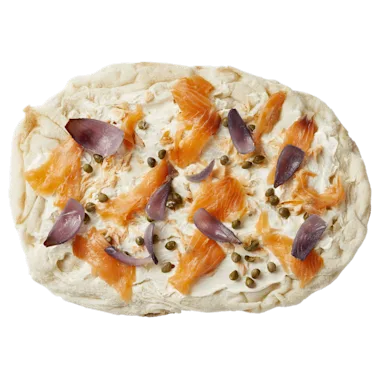 deegspecialiteit (TARWEBLOEM, water, rijstmeel, SOJAMEEL, rijstgriesmeel, zout, extra vergine olijfolie, gedroogde zuurdesem starter (TARWE), gedroogde gist), creme fraiche (room (MELK), MELK), gerookte zalm (zalm (VIS), zout, conserveermiddel: gebufferde azijn, rook), rode ui, kappertjes (kappertjes, water, zout, voedingszuur: azijnzuur), dille.