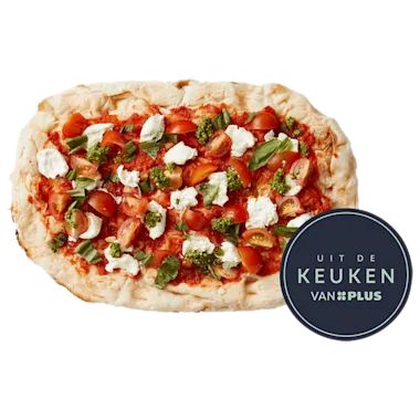 deegspecialiteit met tomatensaus, cherrytomaten, buffelmozzarella, groene pesto en basilicum