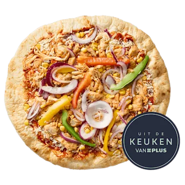 pizzabodem met tomatenpassata (TARWEBLOEM, water, tomatenpassata, pomace olijfolie, zout, gist, meelverbeteraar: E300, zuurteregelaar: citroenzuur), tomatensaus (tomaat, water, zout, basilicum, oregano, ui, natuurlijk aroma), kip (kipfilet, kipdijvlees, water, azijn, natuurlijk aroma, aardappelzetmeel, zout, specerijen, aroma's, gedroogde ui, kippeneiwit, peperextract, bruine suiker, knoflook, rookaroma, maltodextrine, gedroogde paprika, dextrose, citroenschil, voedingszuur: citroenzuur), mozzarella (MELK, aardappelzetmeel, zout, zuursel, stremsel), paprika, mais (mais, water), rode ui, barbecuesaus (tomatenpuree, ui, paprika, suiker, natuurazijn, water, gemodificeerd maïszetmeel, zout, natuurlijk aroma, uienconcentraat, korianderzaad, fenegriekzaad, voedingszuur: citroenzuur, conserveermiddel: E202).