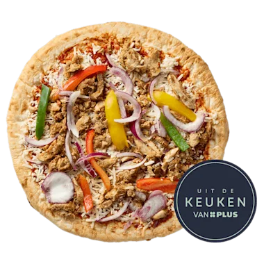 pizza met tomatenpassata, tomatensaus, geraspte mozzarella, gegaarde en gekruide kip, paprika, rode ui, knoflooksaus en shoarmaspecerijen