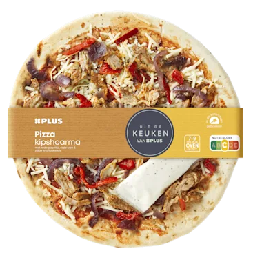 Luchtige pizzabodem met tomatensaus, zachte mozzarella, kruidige kipshoarma reepjes, gegrilde rode paprika en ui + een sachetje knoflooksaus voor de ultieme shoarma beleving.