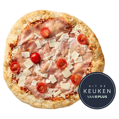 pizzabodem met tomatenpassata (TARWEBLOEM, water, tomatenpassata, pomace olijfolie, zout, gist, meelverbeteraar: E300, zuurteregelaar: citroenzuur), tomatensaus (tomaat, water, zout, basilicum, oregano, ui, natuurlijk aroma), mozzarella (MELK, aardappelzetmeel, zout, zuursel, stremsel), cherrytomaten, rauwe ham (varkensvlees, zout, suiker, conserveermiddel: E250/E252, rook), Grana Padano flakes (rauwe MELK, zout, conserveermiddel: EI-LYSOZYM, stremsel).