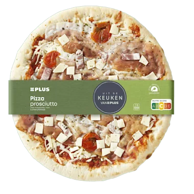 Luchtige pizzabodem met tomatensaus, zachte mozzarella, prosciutto, gerookte spekblokjes, cherrytomaatjes, fromarella flakes en pizzakruiden.
