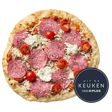 pizzabodem met tomatenpassata (TARWEBLOEM, water, tomatenpassata, pomace olijfolie, zout, gist, meelverbeteraar: E300, zuurteregelaar: citroenzuur), tomatensaus (tomaat, water, zout, basilicum, oregano, ui, natuurlijk aroma), mozzarella (MELK, aardappelzetmeel, zout, zuursel, stremsel), salami (varkensvlees, zout, dextrose, sucrose, aroma's, peper, antioxidant: E301, conserveermiddel: E250/E252), cherrytomaten, buffelmozzarella (BUFFELMELK, zout, stremsel), basilicum.
