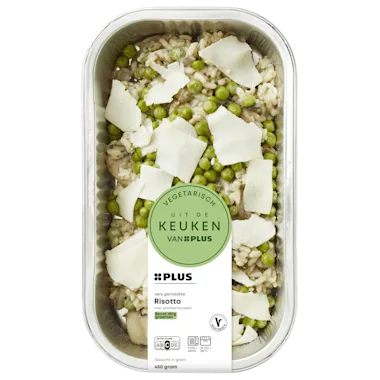 Ingrediënten :44% Gekookte rijst (water, rijst), 18% doperwten, 14% champignons, 8% oesterzwam, 4,5% kaas (gethermiseerde MELK, zout, vegetarisch stremsel, conserveermiddel: EI-LYSOZYM), gepasteuriseerde kookroom (room (MELK), gemodificeerd maiszetmeel, stabilisator: E407), roomboter (MELK), raapzaadolie, peterselie, ui, conserveermiddel: gebufferde azijn, olijfolie, bouillonpoeder (zout, gistextract, glucosestroop, raapzaadolie, aroma, SOJA-EIWITHYDROLISAAT, witte peper, kurkuma, foelie, aardappelzetmeel, uienolie), zout, knoflookpuree, zwarte peper, azijn, tijm.