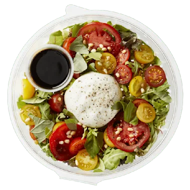 Burrata (gepasteuriseerde MELK, room (MELK), zuurteregelaar: E270, zout, stremsel), trostomaten, rucolamelange (lollo rosso, rucola, red chard), balsamicoazijn (gekookte druivenmost (SULFIET), wijnazijn (SULFIET)), pijnboompitten.