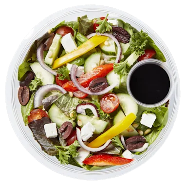 rode quinoa (rode quinoa, water, raapzaadolie, conserveermiddel: gebufferde azijn, azijn), slamelange (lollo rosso, rucola, red chard), cherrytomaat, witte kaasblokjes (MELK, zout, zuursel (MELK), vegetarisch stremsel), ijsbergsla, kalamata olijven (kalamata olijven, water, zeezout, rodewijnazijn), balsamico azijn (gekookte druivenmost (SULFIET), wijnazijn (SULFIET)), rode ui, pijnboompitten, peterselie, komkommer, paprika.