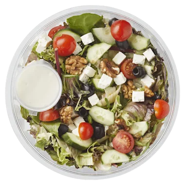 ijsbergsla, rucolamelange (lollo rosso, rucola, red chard), cherrytomaten, komkommer, witte kaasblokjes (kaas (MELK, zout, zuursel (MELK), vegetarisch stremsel), water, zout, zuurteregelaar: E270), zwarte olijven (zwarte olijven, water, zout, stabilisator: E579), yoghurtdressing (water, raapolie, magere yoghurt (MELK), natuurazijn, suiker, maïszetmeel, gemodificeerd maïszetmeel, VRIJE-UITLOOPKIPPENEI, VRIJE-UITLOOPKIPPENEI-EIGEEL, zout, MOSTERD (water, MOSTERDZAAD, natuurazijn, kurkuma), verdikkingsmiddel: johannesbroodpitmeel, voedingszuur: citroenzuur, ui-concentraat, conserveermiddel: E202, aroma, antioxidant: E385), WALNOTEN.