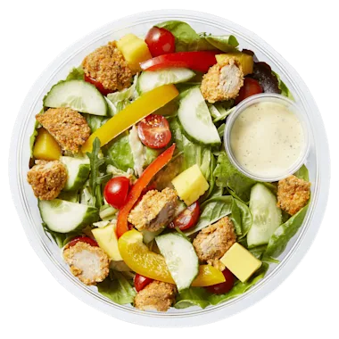 rode quinoa (rode quinoa, water, raapzaadolie, conserveermiddel: gebufferde azijn, azijn), gepaneerde kip (gemarineerde kipdijfilet (kipdijfilet, zonnebloemolie, azijn, rijstmeel, zout, specerijen, tijm, aardappelzetmeel, maltodextrine, paprikaconcentraat, gistextract, gebrande suiker, aroma, gerookt zout, natuurlijk aroma), paneermix (tarwebloem, kruiden, specerijen (mosterd), zout, aroma's (soja), dextrose, gist, kleurstof: carotenen, maltodextrine, water, suiker, zonnebloemolie, gerstemoutextract, rijstmeel, emulgator: e472e, paprikaconcentraat, gistextract, uipoeder, zoethoutwortelpoeder), slamelange (lollo rosso, rucola, red chard), cherrytomaat, komkommer, ijsbergsla, mango, honing-mosterddressing (water, raapolie, natuurazijn, suiker, honing, mosterdmeel, zout, vrije-uitloopei, vrijeuitloopkippenei-eigeel, mosterdzaad, verdikkingsmiddel: guarpitmeel/johannesbroodpitmeel/xanthaangom, citroensap, gemodificeerd maïszetmeel, conserveermiddel: e202, antioxidant: e385, kleurstof: carotenen), paprika.
