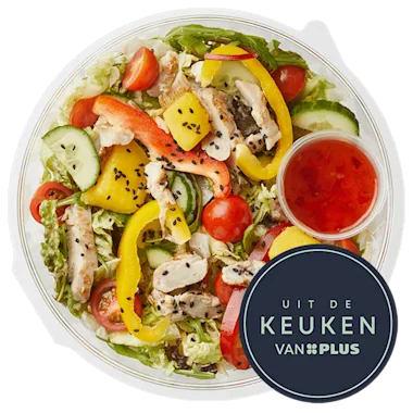 salade met gekookte rijstnoedels met groenten, rucolamelange, cherrytomaten, komkommer, gegaarde kipdijfiletreepjes, ijsbergsla, mango, pittige chilisaus, paprika en geroosterd sesamzaad