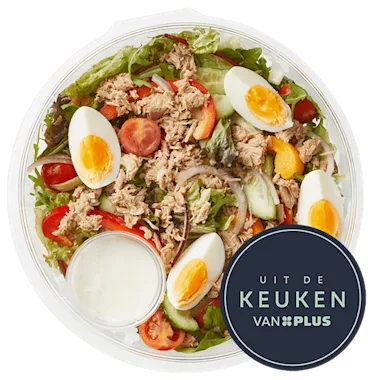 krieltjes met kruiden (aardappel, olijfolie, knoflook, zeezout, tijm, peterselie, bieslook), rucolamelange (lollo rosso, rucola, red chard), EI, cherrytomaten, komkommer, tonijn in olijfolie (tonijn (VIS), olijfolie, zout), ijsbergsla, dressing met magere yoghurt (water, raapolie, magere yoghurt (MELK), azijn, suiker, maïszetmeel, gemodificeerd maïszetmeel, VRIJE-UITLOOPKIPPENEI, VRIJE-UITLOOPKIPPENEI-EIGEEL, zout, MOSTERD (water, MOSTERDZADEN, azijn, kurkuma), verdikkingsmiddel: guarpitmeel, voedingszuur: citroenzuur, ui-extract, conserveermiddel: E202, aroma, antioxidant: E385), paprika, rode ui.