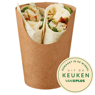 tortilla (tarwebloem, water, stabilisator: e422, raapzaadolie, suiker, zout, rijsmiddel: e500, voedingszuur: e296, conserveermiddel: e202/e282, emulgator: e471), kipdijfiletreepjes (kipdijfilet, voedingszuur: e262/e326/e330, aardappelzetmeel, zout, dextrose, conserveermiddel: gebufferde azijn, rozemarijnextract, zonnebloemolie), buffelmozzarella (buffelmelk, zout, stremsel), pesto (zonnebloemolie, basilicum, geraspte kaas (melk, zout, aardappelzetmeel, zuursel, stremsel), cashewnoten, water, azijn, citroensap, knoflook, suiker, zout, specerijen, verdikkingsmiddel: guarpitmeel/xanthaangom), zongedroogde tomaatreepjes (gemarineerde zongedroogde tomaat (zongedroogde tomaten, water, wijnazijn (sulfiet), zeezout, zuurteregelaar: e270/e330, antioxidant: ascorbinezuur), zonnebloemolie, kappertjes, tijm, knoflookpasta (knoflook, zout, voedingszuur: citroenzuur)), rucola.