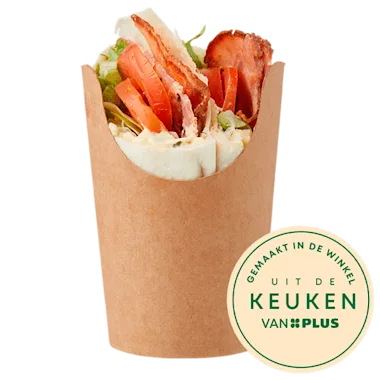Tortilla (TARWEBLOEM, water, stabilisator: E422, raapzaadolie, suiker, zout, rijsmiddel: E500, voedingszuur: E296, conserveermiddel: E202/E282, emulgator: E471), oude kaassalade (water, oude kaas (gepasteuriseerde MELK, zout, zuursel, stremsel), raapzaadolie, suiker, maïszetmeel, VRIJE-UITLOOPKIPPENEI-EIGEEL, azijn, kaaspoeder (gepasteuriseerde MELK, zout, zuursel, stremsel), gemodificeerd maïszetmeel, zout, MOSTERDZAAD, bieslook, conserveermiddel: E202/E211, voedingszuur: citroenzuur, verdikkingsmiddel: xanthaangom, wortelextract, zonnebloemolie, specerijen), tomaat, spekplakjes (varkensvlees, zout, zuurteregelaar: E326, antioxidant: E301/E331, conserveermiddel: E250/E262, specerijextracten, rook), ijsbergsla.