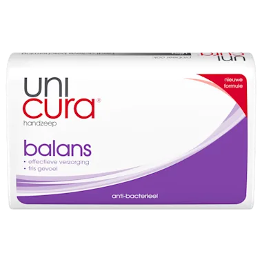 Het klinisch bewezen Unicura Balans Soapbar is speciaal ontwikkeld om elke dag te zorgen voor schone handen. De formule met een antibateriëel ingrediënt beschermt je handen effectief tegen elke vorm van bacteriën die je tegenkomt tijdens je dagelijkse bezigheden. Het zeeptablet zorgt ook voor een zachte en soepele huid voor een complete en gebalanceerde verzorging.
