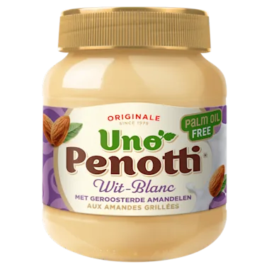 Deze overheerlijke, witte boterhampasta is bereid met de beste ingrediënten (amandelen, cacaoboter, melk) en bevat geen palmolie.