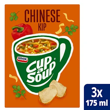 Heb je zin in een lekker soepje? Of heb je een drukke dag en zin in een snack om weer scherp en alert door te kunnen? Dan zit je bij Cup-a-Soup altijd goed! Zo ook met Cup-a-Soup Chinese Kip: een snelle, hartige opkikker die je weer energie geeft om door te gaan! Deze soep zit vol malse stukjes kip, maar bevat ook groenten als rode paprika, Chinese paddenstoel, spinazie en ui, voor net wat meer pit. In een verpakking Cup-a-Soup Chinese Kip zitten 3 heerlijke zakjes Cup-a-Soup. Een zakje van deze heerlijke Cup-a-Soup Chinese Kip bevat 40 calorieën per mok. Zoals je van ons gewend bent, besteden wij veel zorg en aandacht aan ons recept en gebruiken wij alleen de beste ingrediënten om de goede smaak te waarborgen. Daarnaast bevat deze Cup-a-Soup Chinese Kip geen kunstmatige kleurstoffen, conserveermiddelen of toegevoegde smaakversterkers. De Cup-a-Soup Chinese Kip is eenvoudig en snel te bereiden: doe de inhoud van het zakje in jouw favoriete mok en giet er 175 ml kokend water bij. Daarna eventjes roeren, 1 minuutje wachten en klaar, eet smakelijk! Zo bereid je binnen een handomdraai een heerlijke mok soep. Thuis, op kantoor of waar je ook bent, Cup-a-Soup is altijd een heerlijk hartig tussendoortje. Lekker, makkelijk en snel! 4-uur Cup-a-Soup: BAM! En weer helemaal scherp!