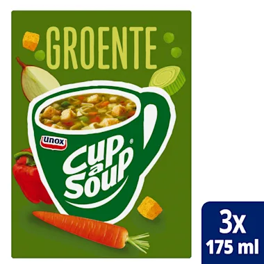 Unox Groente Cup-a-Soup is een snelle, hartige opkikker die je weer energie geeft om door te gaan! Een heerlijke groentesoep met rode paprika, ui, wortel, erwt, knolselderij, prei en knapperige croutons. Heb je een drukke dag en zin in een snack? Of heb je gewoon zin in een lekker soepje? Thuis, op kantoor of waar je ook bent, Cup-a-Soup is altijd een heerlijk hartig tussendoortje. Lekker, makkelijk en snel! In een verpakking zitten 3 zakjes Cup-a-Soup. Een zakje van deze heerlijke Unox Groente Cup-a-Soup bevat slechts 60 calorieën per mok. Zoals je van ons gewend bent, besteden wij veel zorg en aandacht aan ons recept en gebruiken wij alleen de beste ingrediënten om de goede smaak te waarborgen. Daarnaast bevat deze soep geen kunstmatige kleurstoffen, toegevoegde smaakversterkers en conserveermiddelen. Deze variant is geschikt voor vegetariërs en veganisten. Cup-a-Soup: dat zouden meer mensen moeten doen!