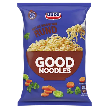 Zoals je van ons gewend bent, besteden wij veel zorg en aandacht aan onze recepten en ingrediënten. Daarom bevat Unox Good Noodles Rund geen kunstmatige kleurstoffen en conserveermiddelen. Unox Good Noodles biedt een gevarieerd aanbod van snackmaaltijden om van te genieten waar en wanneer je maar wilt: thuis, tijdens het studeren, op kantoor, voor het sporten of gewoon even tussendoor. Probeer ook eens een van onze andere varianten, zoals Unox Good Noodles Oosterse Kip, Unox Good Noodles Saté of Unox Good Noodles Groente. Unox Good Noodles: daar kun je lekker lang op door!