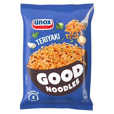 Unox Good Noodles Teriyaki is een lekkere snack met noedels en een teriyakisaus. Het dagelijks leven kan soms erg druk zijn: werk, vrienden, familie, studie en sport. Hierdoor krijg je vanzelf zin in een tussendoortje of een kleine maaltijd. Maak het jezelf makkelijk en probeer de Unox Good Noodles Teriyaki. Het is een lekkere snack die je snel en makkelijk klaar kunt maken. Zoals je van ons gewend bent, besteden wij veel zorg en aandacht aan onze recepten en ingrediënten. Daarom bevat Unox Good Noodles Teriyaki geen conserveermiddelen. Unox Good Noodles biedt een gevarieerd aanbod van snackmaaltijden om van te genieten waar en wanneer je maar wilt: thuis, tijdens het studeren, op kantoor, voor het sporten of gewoon even tussendoor. Probeer ook eens een van onze andere varianten, zoals Good Noodles met de smaak van pittige kip of Good Noodles Groente. Unox Good Noodles: daar kun je lekker lang op door!