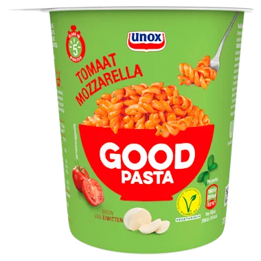 Unox Good Pasta Tomaat Mozzarella is een lekkere instant pasta met tomatensaus. Het dagelijks leven kan soms erg druk zijn: werk, vrienden, familie, studie en sport. Hierdoor krijg je vanzelf zin in een lekkere boost! Unox biedt een gevarieerd aanbod van snacks om van te genieten waar en wanneer je maar wilt als maaltijd of als tussendoortje. Maak het jezelf makkelijk en probeer de Unox Good Pasta Tomaat Mozzarella in een handige cup. Een snel en heerlijk pastagerecht op basis van fusilli met een tomatensaus met basilicum en mozzarella, die je snel en makkelijk klaar kunt maken!