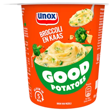 Maak het jezelf makkelijk en probeer de Unox Good Potatoes Broccoli en Kaas in een handige cup. Het is een lekkere goedgevulde aardappelpuree met broccoli en kaas die je snel en makkelijk klaar kunt maken! Want het dagelijks leven kan soms erg druk zijn: werk, vrienden, familie, studie en sport. Hierdoor krijg je vanzelf zin in een lekkere boost! Unox biedt een gevarieerd aanbod van snacks om van te genieten waar en wanneer je maar wilt als tussendoortje of kleine maaltijd. Unox Good Potatoes: een heerlijke aardappelsnack voor de snelle trek.