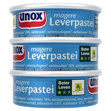 Unox Magere Leverpastei bevat 35% minder vet dan de gewone leverpastei en is heerlijk voor op je brood of op een toastje bij de borrel. Daarbij is de leverpastei van Unox beloond met het Beter Leven-keurmerk 1 ster. Dit betekent dat de varkens waar de leverpastei van gemaakt wordt, een beter leven hebben gehad dan varkens zonder dit keurmerk. Hier zijn strikte richtlijnen voor, gemaakt door de dierenbescherming. De Unox Leverpastei is verkrijgbaar in een reguliere, magere en vegetarische variant. Dit is een voordeelverpakking met 3 blikjes van 56 g magere leverpastei.