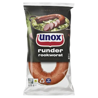 Unox Runder Rookworst is een van de heerlijke producten van Unox. Unox rookworst is al ruim 80 jaar een vaste gast aan de Nederlandse eettafel. Lekker opwarmen met een dampend bord stamppot of samen aan tafel genieten van een kom erwtensoep: de rookworsten van Unox zijn onmisbaar in een gezonde en gevarieerde Hollandse pot. Unox Runder Rookworst is gemaakt van 100% rundvlees met het keurmerk van Beter Leven en is er ook in een overheerlijke vegetarische variant. Tip: in plakjes gesneden rookworst is ook heerlijk op een broodje, of als snack bij de borrel.