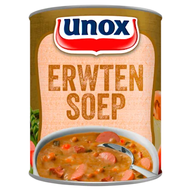 Unox Stevige Erwtensoep in Blik is één van de heerlijke soepen van Unox. Deze stevige soep is rijkgevuld met lekker veel erwten, wortel en selderij, goed voor maar liefst 179 gram groenten per kom soep. Daarnaast bevat de soep de enige échte Unox rookworst met Beter Leven-keurmerk 1 Ster. Een heerlijke soep zonder kunstmatige kleurstoffen of toegevoegde smaakversterkers. Deze erwtensoep is klaar in een handomdraai en goed voor ruim 3 kommen soep. Het blik is bovendien 100% recyclebaar. Bij Unox zijn we echte soepliefhebbers en doen we ons uiterste best om de lekkerste soep te maken, voor iedereen. Geniet van de vertrouwde smaak van Unox.