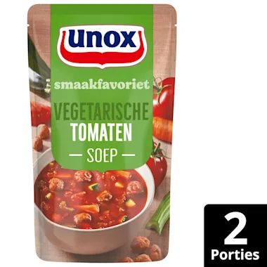Unox Smaakfavoriet Vegetarische Tomaten Soep in Zak is een heerlijke soep, bereid met vegetarische balletjes en een smaakvolle mix van groenten. Deze zak is goed voor twee kommen soep. Deze vegetarische tomatensoep heeft geen kunstmatige kleurstoffen, toegevoegde smaakversterkers of toegevoegde conserveermiddelen. De verschillende groenten, zoals de tomaten en paprika, zorgen samen met de courgette en vegetarische soepballen voor een heerlijk rijke smaak. Deze tomatensoep is klaar in een handomdraai! Bij Unox zijn we echte soepliefhebbers en doen we ons uiterste best om de lekkerste soep te maken, voor iedereen. Daarom hebben we een vegetarische versie van een van onze klassiekers gemaakt. Geniet van de vertrouwde smaak van Unox, ook op een dagje zonder vlees.