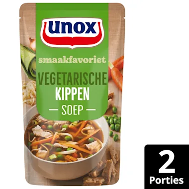 Unox Smaakfavoriet Vegetarische Kippen Soep in Zak is een heerlijke soep, bereid met vegetarische kipstukjes en duurzaam geteelde groenten. Deze zak is goed voor twee kommen soep. Deze vegetarische soep is heerlijk vol van smaak en gemaakt zonder kunstmatige kleurstoffen, conserveermiddelen of toegevoegde suikers. Deze kippensoep is klaar in een handomdraai. Bij Unox zijn we echte soepliefhebbers en we doen ons uiterste best om de lekkerste soepen te maken, voor iedereen. Daarom hebben we van een aantal van onze klassiekers ook een vegetarische versie gemaakt. Op deze manier kun je altijd van je favoriete Unox soep genieten, ook op een dagje zonder vlees. Unox heeft een soep voor elk moment: lekker als lunch, voorgerecht of complete maaltijd.