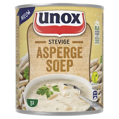 Unox Stevige Aspergesoep in blik is een van de heerlijke soepen van Unox, klaar in een handomdraai en goed voor ruim 3 kommen soep. Als oer-Hollands merk is Unox van alle Nederlanders. We houden van lekker eten en gebruiken hiervoor alleen de lekkerste en beste ingrediënten. Unox Stevige Aspergesoep is een heerlijke soep met smaakvolle asperges en nootmuskaat. Ook lekker als voorgerecht! De Unox Stevige Aspergesoep bevat geen toegevoegde smaakversterkers en conserveermiddelen. Daarom maken wij de beste soepen al sinds 1957. Dit zijn niet alleen de klassieke soepen die je van ons gewend bent, maar we blijven vernieuwen zodat er voor ieder wat wils is. Klinkt lekker toch? Gelukkig is de soep zo klaar! Verwarm de soep in de pan tot het kookpunt of verwarm deze 2,5 minuut in de magnetron (750 watt). Het is heerlijk om de soep vervolgens te combineren met vers brood. We werken continu aan het verbeteren van onze producten. Zo zorgen wij ervoor dat ook de komende generaties op een verantwoorde manier kunnen genieten van onze producten. Unox is daarom al 80 jaar onlosmakelijk verbonden aan de Hollandse keuken. We maken niet alleen soepen, maar ook rookworsten, knaks, snacks en zelfs vegetarische gehaktballetjes. Zo is er dus een voorgerecht, hoofdgerecht of snack voor iedereen. Dat kan alleen maar Unox zijn!