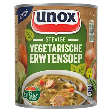 Unox Stevige Vegetarische Erwtensoep in blik is een van de heerlijke soepen van Unox, klaar in een handomdraai en goed voor ruim 3 kommen soep. Als oer-Hollands merk is Unox van alle Nederlanders. We houden van lekker eten en gebruiken hiervoor alleen de lekkerste en beste ingrediënten. Onze oer-Hollandse Unox erwtensoep is er nu ook in vegetarische variant, met vegetarische rookworst en veel lekkere groenten! Deze Vegetarische Erwtensoep bevat geen toegevoegde smaakversterkers en conserveermiddelen. Daarom maken wij de beste soepen al sinds 1957. Dit zijn niet alleen de klassieke soepen die je van ons gewend bent, maar we blijven vernieuwen zodat er voor ieder wat wils is. Klinkt lekker toch? Gelukkig is de soep zo klaar! Verwarm de soep in de pan tot het kookpunt of verwarm deze 2,5 minuut in de magnetron (750 watt). Het is heerlijk om de soep vervolgens te combineren met vers brood. We werken continu aan het verbeteren van onze producten. Zo zorgen wij ervoor dat ook de komende generaties op een verantwoorde manier kunnen genieten van onze producten. Unox is daarom al 80 jaar onlosmakelijk verbonden aan de Hollandse keuken. We maken niet alleen soepen, maar ook rookworsten, knaks, snacks en zelfs vegetarische gehaktballetjes. Zo is er dus een voorgerecht, hoofdgerecht of snack voor iedereen. Dat kan alleen maar Unox zijn!