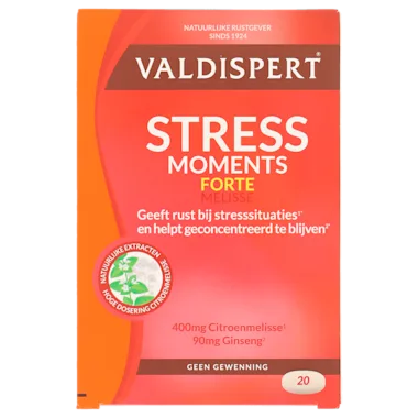 Valdispert Stress Moments Extra Sterk is een natuurlijk en plantaardig middel. Stress Moments bevat als werkstoffen extracten van valeriaanwortel, citroenmelisse, folaat, zink, vitamine B6 en ginseng.
