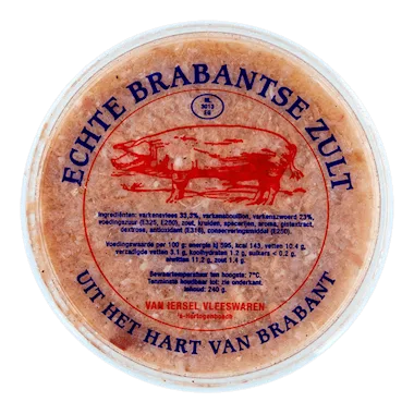 Ingrediënten: Varkensvlees 33.3%, varkensbouillon, varkenszwoerd 23 %, Voedingszuur (E325,E260), zout, kruiden, specerijen, aroma, Gistextract, Dextrose, antioxidant (E316), conserveringsmiddel (E250).