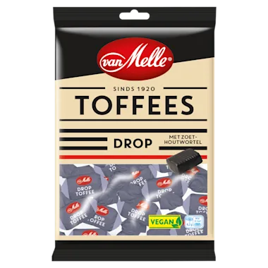 Van Melle Droptoffees met de vertrouwde smaak van drop, maar toch uniek dankzij de lekkere toffeestructuur.