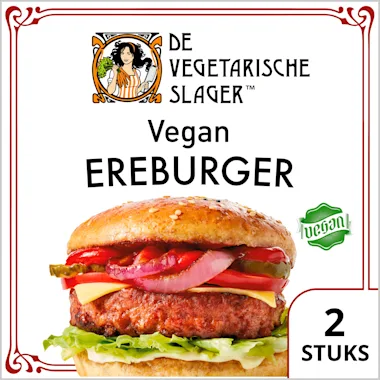 De Vegetarische Slager Ereburger is een sappige vegan premium burger met perfecte structuur en smaack. Gemaakt op basis van soja en rijk aan eiwit, vitamine B12, ijzer en vezels. Van oudsher werd de titel 'Ereburger' toegekend aan hen die onderscheidende prestaties hebben geleverd. Dat inspireerde ons deze plantaardige burger toe te voegen aan het ereburgerschap. Een nieuw burgerinitiatief, dat mooi rosé gebakken het best tot z'n recht komt. Geschikt voor iedere burgerliefhebber: van vegan en vegetariërs tot carnivoor. Serveer met liefde aan de grootste vleesliefhebber en geniet!