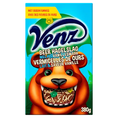 Ingrediënten: Beer hagelslag: suiker, magere cacaopoeder, cacaoboter*, geheel gehard palmpitvet, weipoeder (MELK), magere MELKPOEDER, TARWEZETMEEL, LACTOSE, gefractioneerd MELKVET (harde fractie), emulgator (SOJALECITHINE), plantaardige vezel (oligofructose), aroma (bevat MELK)., Funnies: suiker, cacaoboter, magere MELKPOEDER, WEIPOEDER, emulgator (SOJALECITHINE), aroma, kleurstoffen (E141, E160c), wortelextract., *Rainforest Alliance gecertificeerd.ra.org