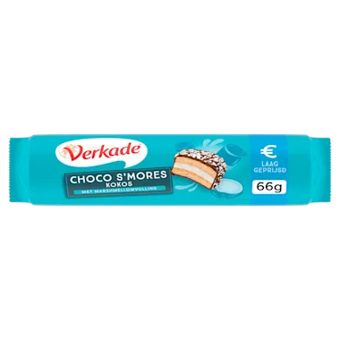 Verkade Choco s'mores Kokos; heerlijke combinatie van koek, marshmallow en chocolade. Twee koekjes met een vulling van marshmallow en kokos, omhuld met lekkere melkchocolade van Verkade. Écht lekker!