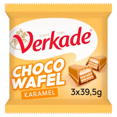 Verkade Chocowafel Karamel, knapperige laagjes wafel met een zachte crèmelaag omhuld in melkchocolade en gecoat met romige gouden karamelchocolade. Écht lekker voor onderweg!